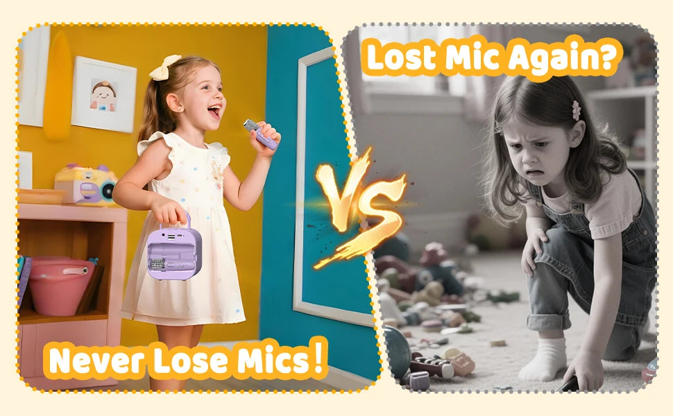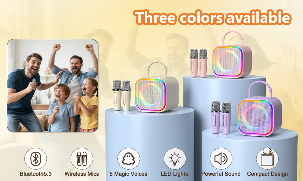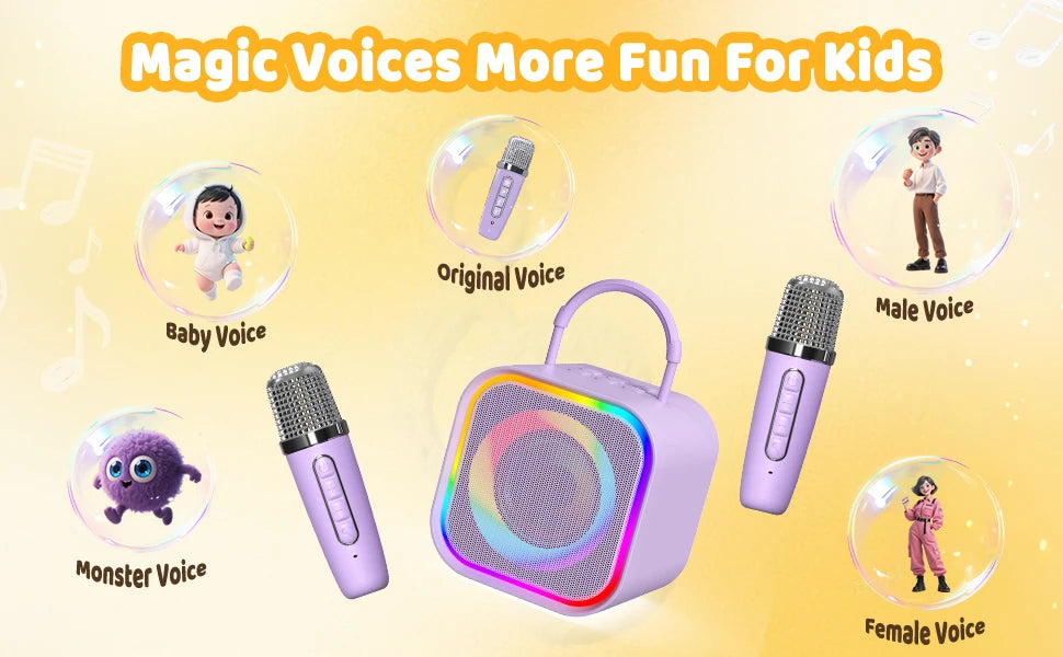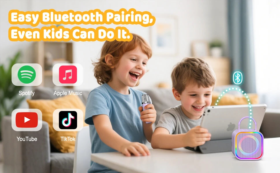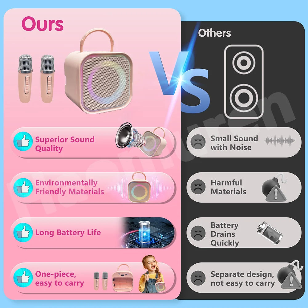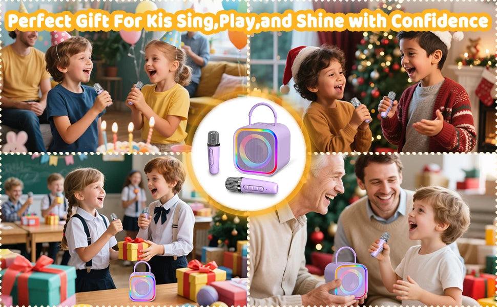 A Haomuren Kids Mini Karaoke Machine é um karaokê infantil portátil desenvolvido especialmente para crianças, combinando diversão, aprendizado e interação em um único produto. Ideal como presente de aniversário, Natal ou datas comemorativas, este karaokê Bluetooth com microfones sem fio transforma qualquer ambiente em um verdadeiro palco musical. Compacto, leve e fácil de transportar, ele permite que as crianças cantem, brinquem e soltem a criatividade em casa, em festas ou em passeios ao ar livre.