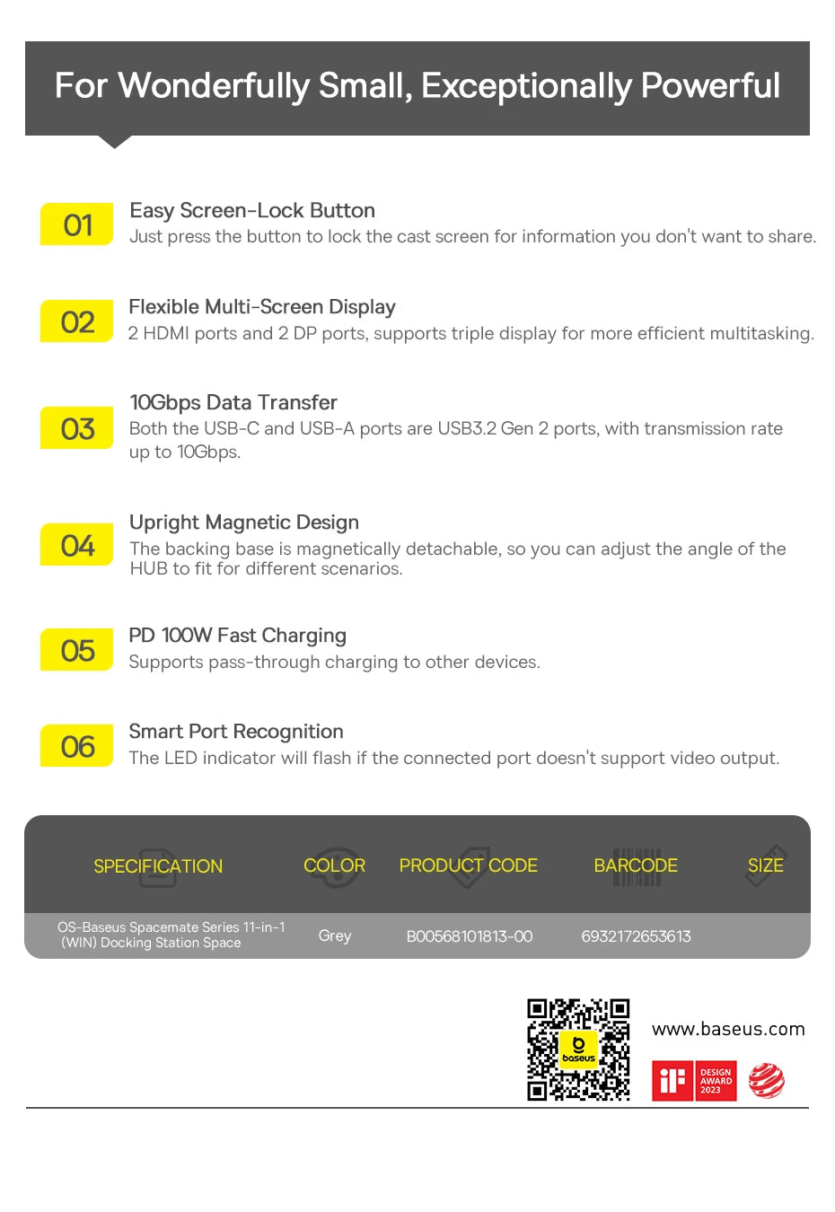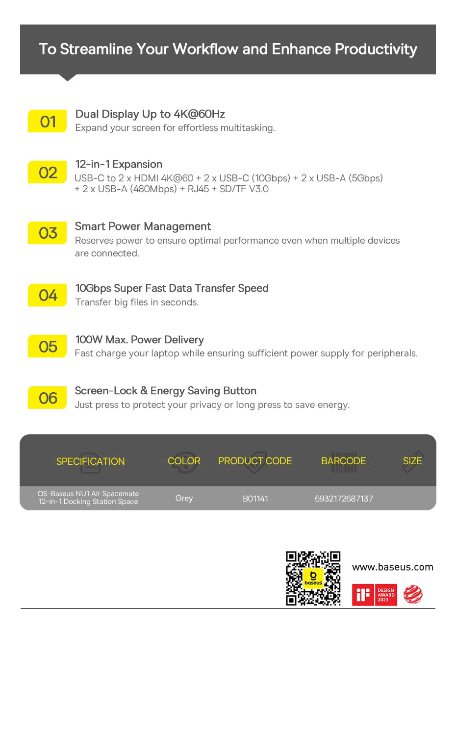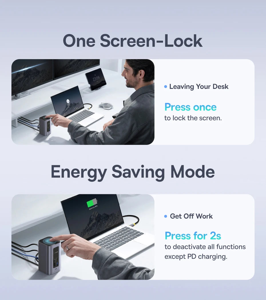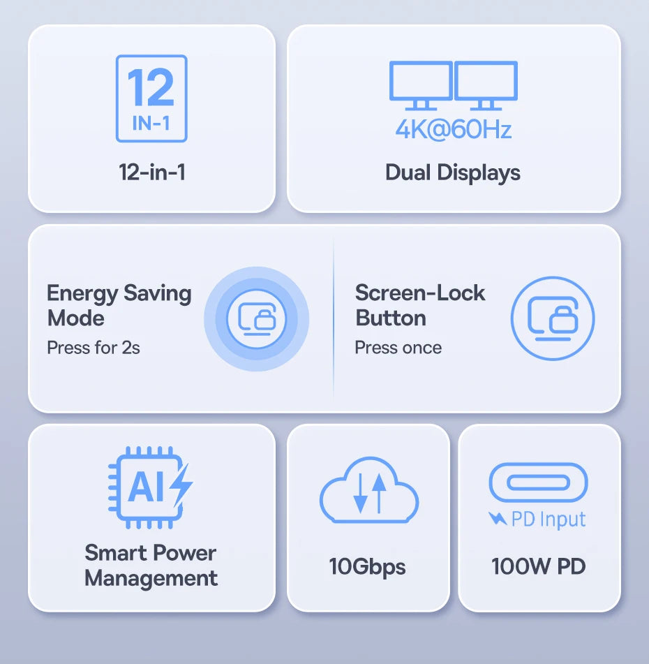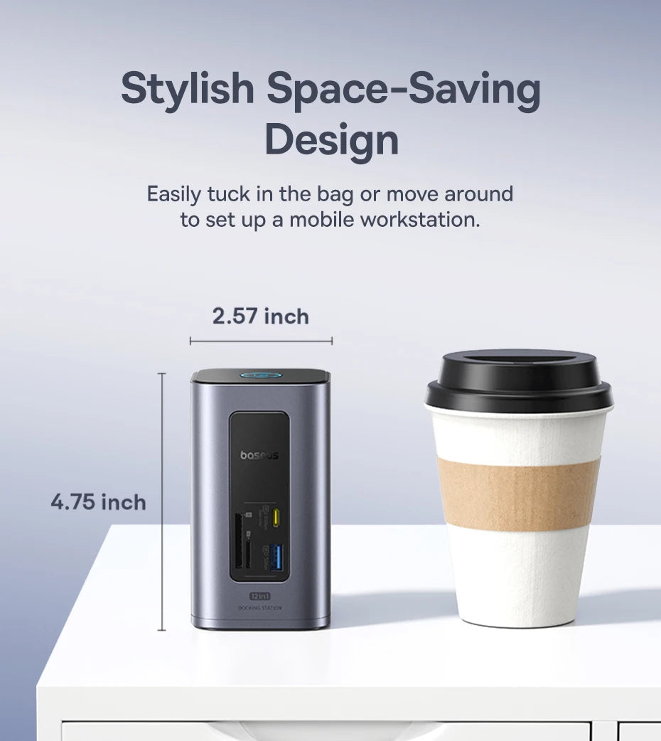 Com recursos inteligentes como gerenciamento de energia eficiente, modo de economia de energia e design compacto que economiza espaço, o Baseus Hub USB-C 12 em 1 é a escolha ideal para quem busca uma estação de acoplamento confiável, robusta e preparada para demandas profissionais modernas.