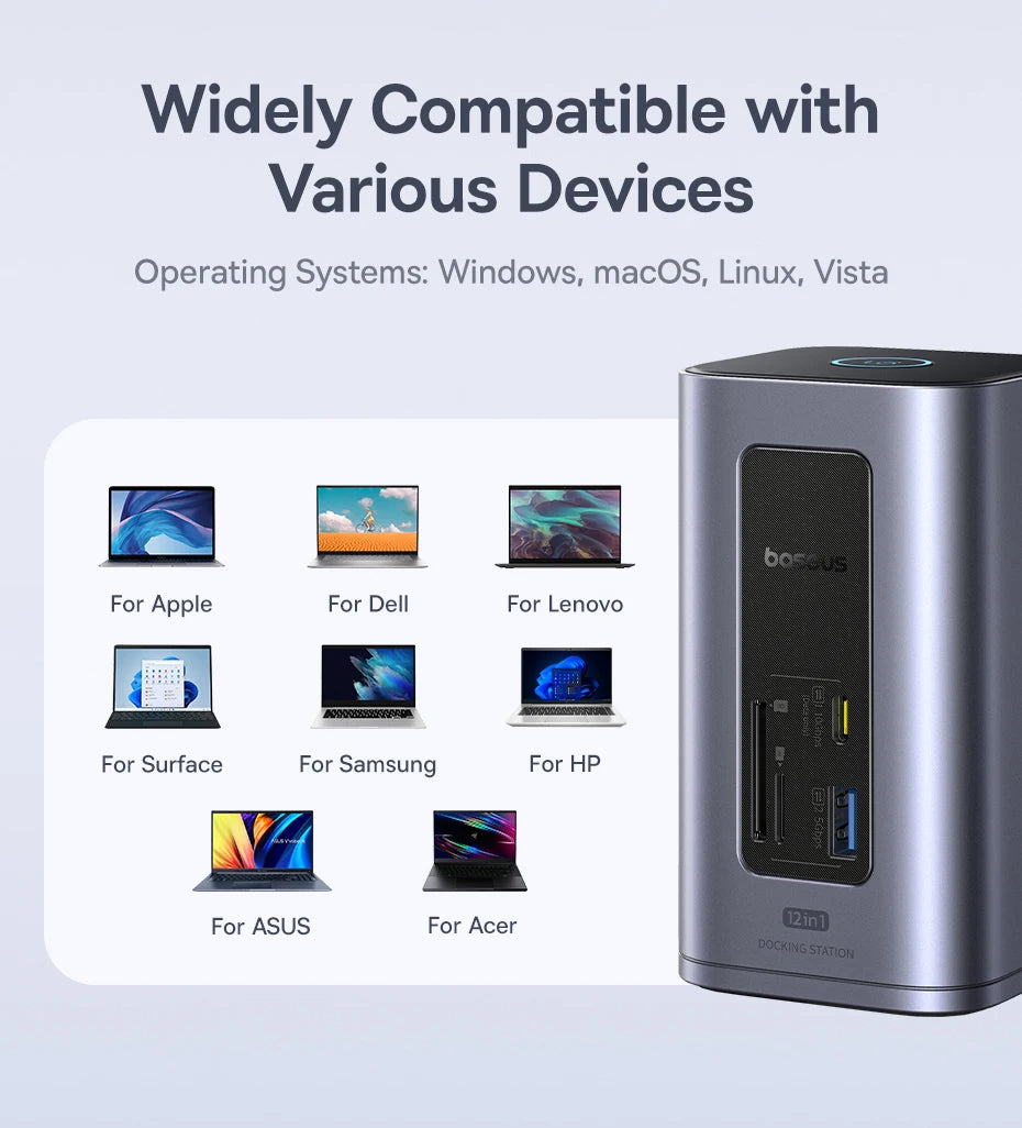 Projetado para usuários que exigem eficiência no dia a dia, o Hub USB-C Baseus 12 em 1 permite conectar simultaneamente monitores externos, periféricos USB, rede cabeada, cartões de memória e alimentação de energia. A compatibilidade com Windows, macOS, Linux e outros sistemas torna este adaptador USB-C uma solução versátil tanto para uso corporativo quanto pessoal.