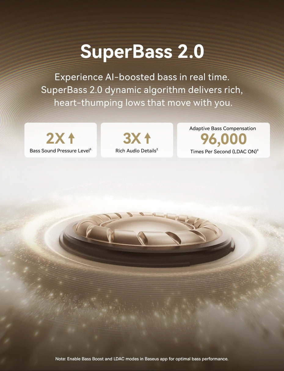 No desempenho sonoro, o Baseus Bowie MC1 Pro se destaca pelo áudio de alta resolução com suporte ao codec LDAC, permitindo transmissão de mais dados e maior fidelidade sonora. Os drivers dinâmicos de 16 mm, aliados ao algoritmo exclusivo de aprimoramento de graves da Baseus, entregam graves potentes, médios detalhados e agudos claros, com palco sonoro amplo e envolvente.