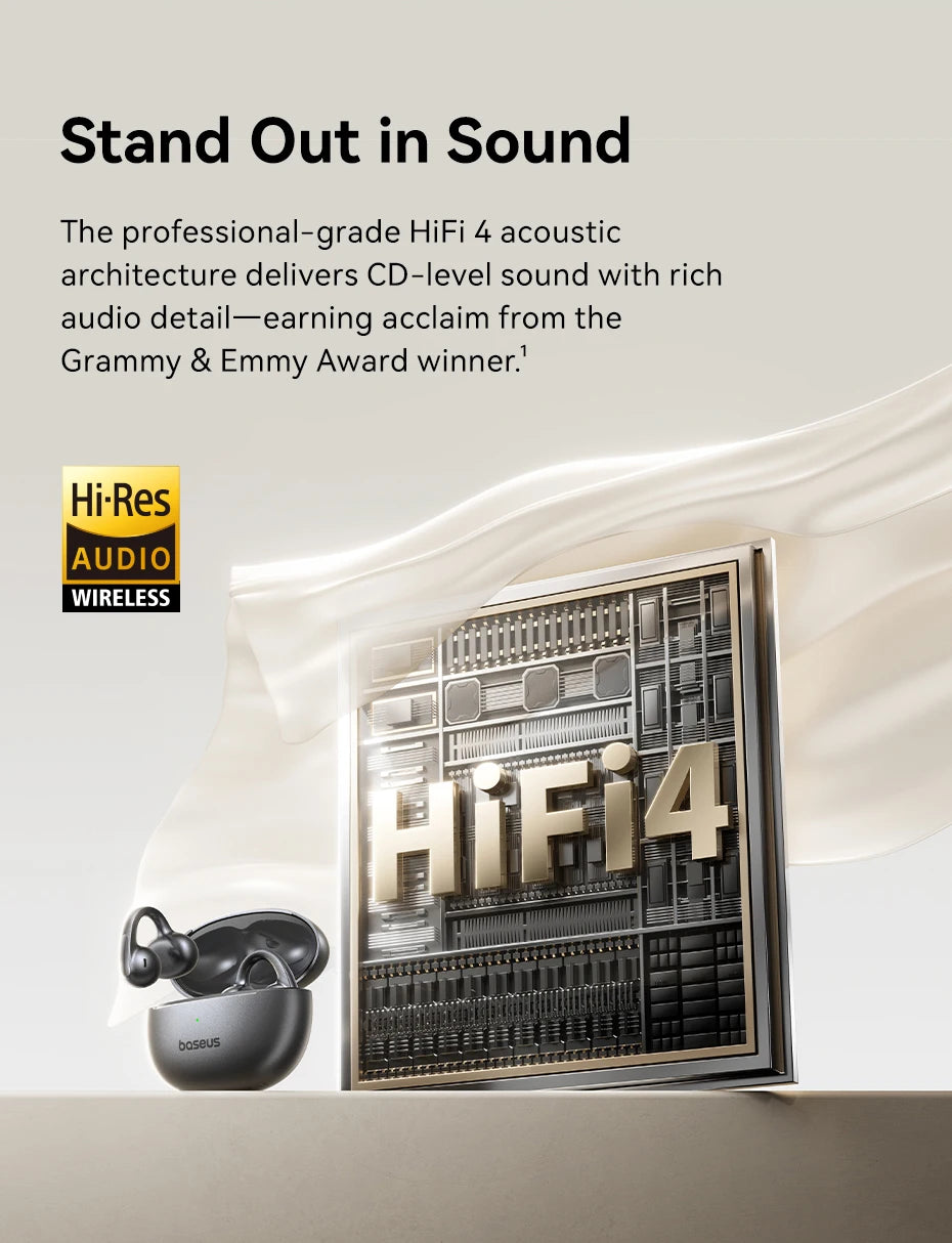 O design de clipe de orelha aberta garante encaixe firme sem pressionar o canal auditivo. A tecnologia exclusiva Cloud AirCushion da Baseus oferece sensação macia e ergonômica, com aumento significativo de estabilidade e conforto. O sistema de suporte em quatro pontos e a estrutura flexível C-Bridge adaptam-se a diferentes formatos de orelha, proporcionando uso seguro mesmo em movimentos intensos.