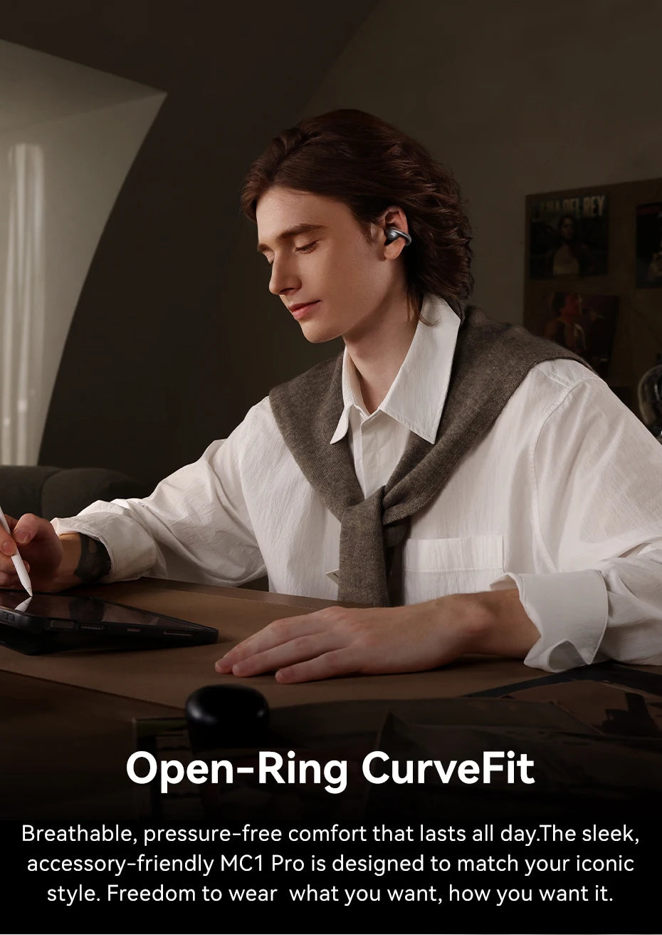 O grande diferencial do Baseus Bowie MC1 Pro é o design open-ear com clipe, que combina segurança, conforto e estabilidade, permitindo ouvir música sem perder a consciência do ambiente.