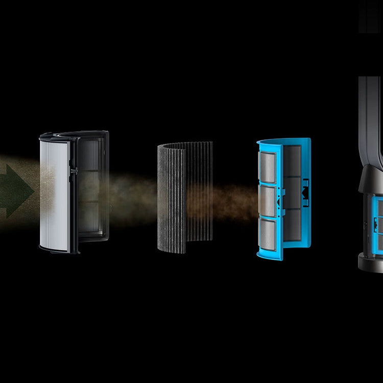 O sistema de purificação do Dyson Purifier Cool TP12 utiliza três estágios de filtragem dentro de uma estrutura totalmente selada. O filtro HEPA H13 captura partículas microscópicas, enquanto o filtro de carvão enriquecido atua na adsorção de gases e odores. O filtro catalítico destrói o formaldeído de forma contínua, sem saturação.