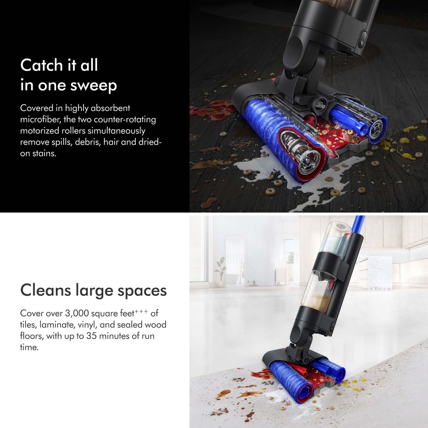 Equipado com dois rolos de microfibra motorizados e contra-rotativos, o Dyson WashG1 atua diretamente sobre manchas difíceis, líquidos derramados, resíduos secos e partículas maiores. Diferente de máquinas que utilizam sucção tradicional, este sistema separa mecanicamente os detritos sólidos dos líquidos, evitando a recirculação de odores e garantindo uma limpeza mais controlada e eficiente do piso.