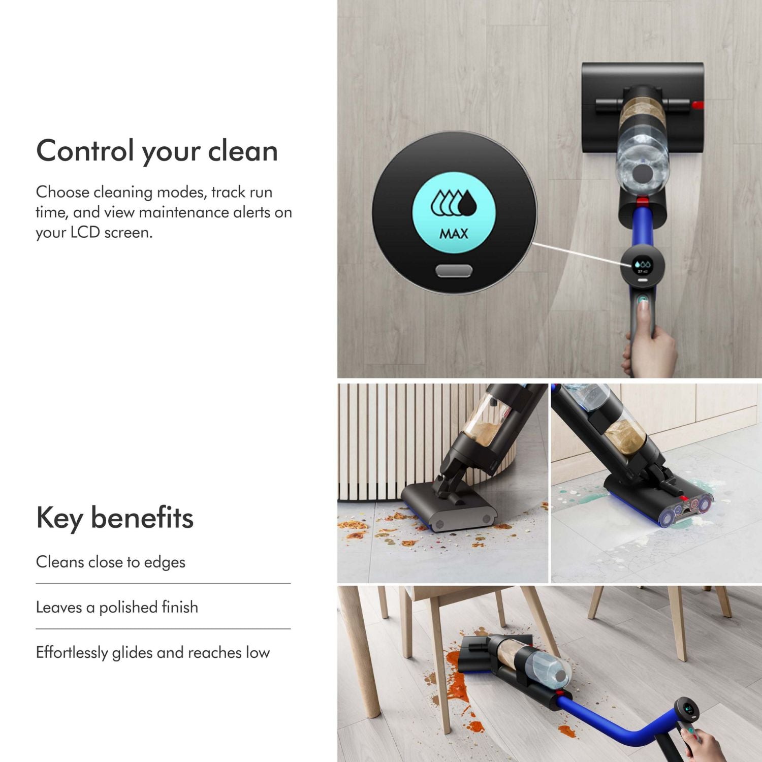 Projetado para cobrir grandes áreas, o Dyson WashG1 é capaz de limpar mais de 3000 pés quadrados de pisos como cerâmica, laminado, vinílico e madeira selada, oferecendo até 35 minutos de autonomia. Sua estrutura facilita a condução ao redor de móveis, permitindo alcançar áreas baixas e espaços difíceis com movimentos suaves e precisos.