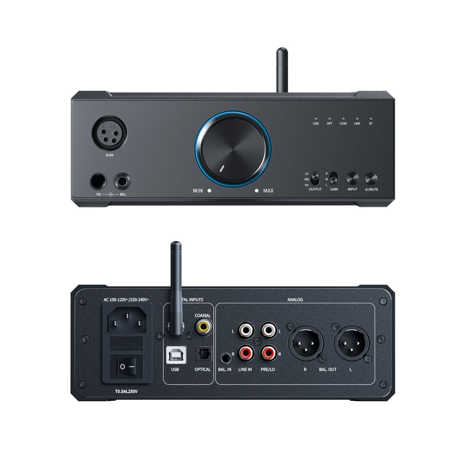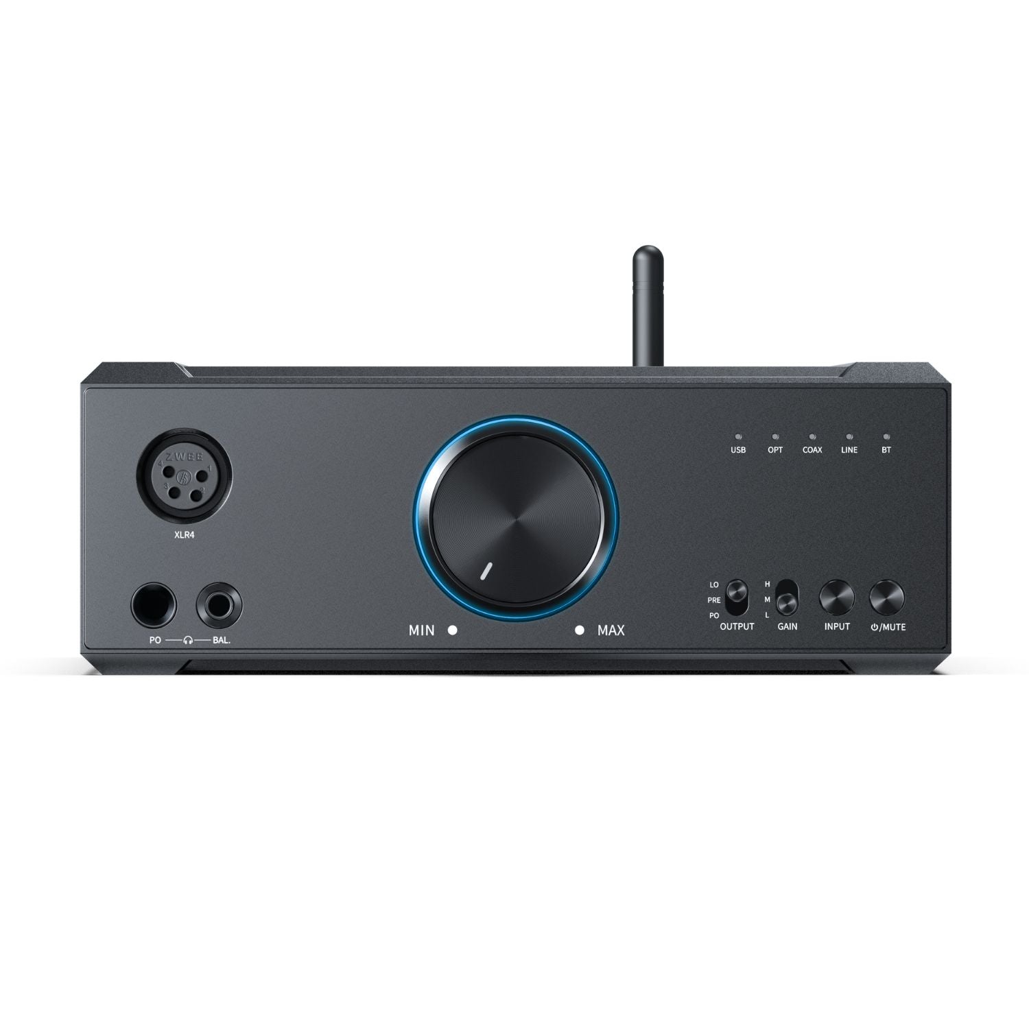 Seu sistema de ganho em três níveis permite usar tanto fones intra-auriculares sensíveis quanto headphones de alta impedância. O seletor de modos (LO, PRE e PO) oferece flexibilidade para uso como DAC puro, pré-amplificador ou amplificador de fones. A experiência é complementada por um knob de volume com controle digital de 120 níveis e anel RGB que indica taxa de amostragem e codec Bluetooth ativo.