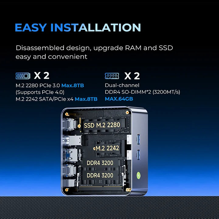 Outro grande diferencial do Mini PC GMKtec NucBox M3 é a sua flexibilidade de configuração. Ele está disponível tanto em versão barebone, ideal para quem deseja personalizar totalmente o equipamento, quanto em versões prontas com diferentes capacidades de memória RAM e armazenamento SSD, atendendo a diferentes perfis de usuários.