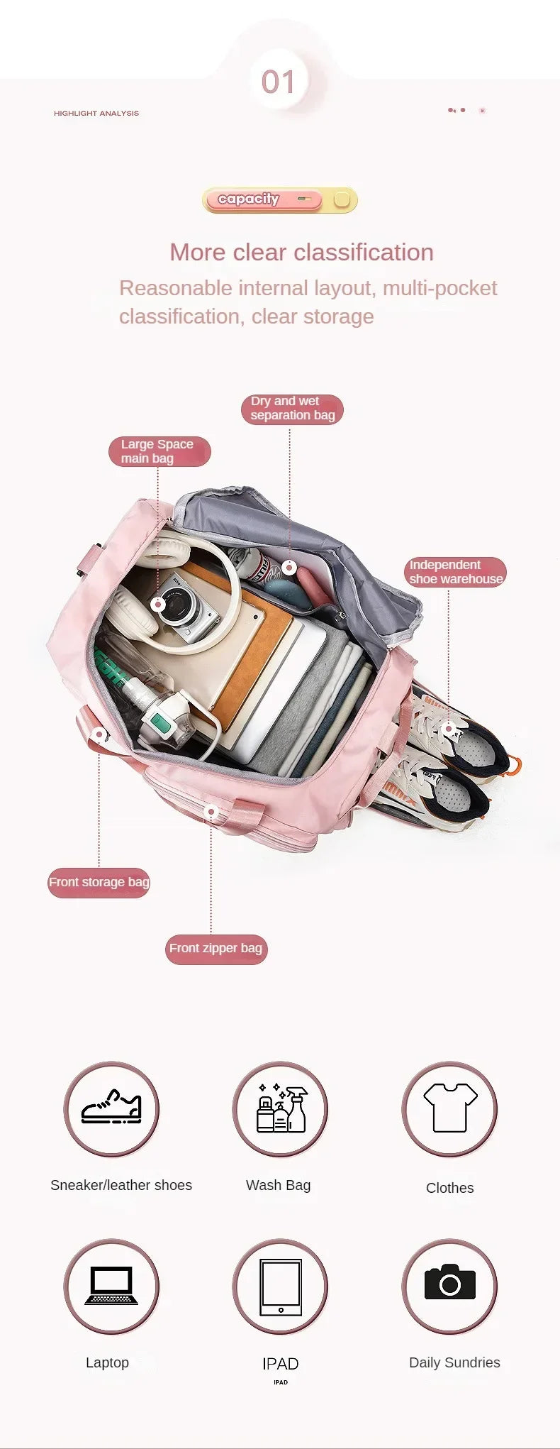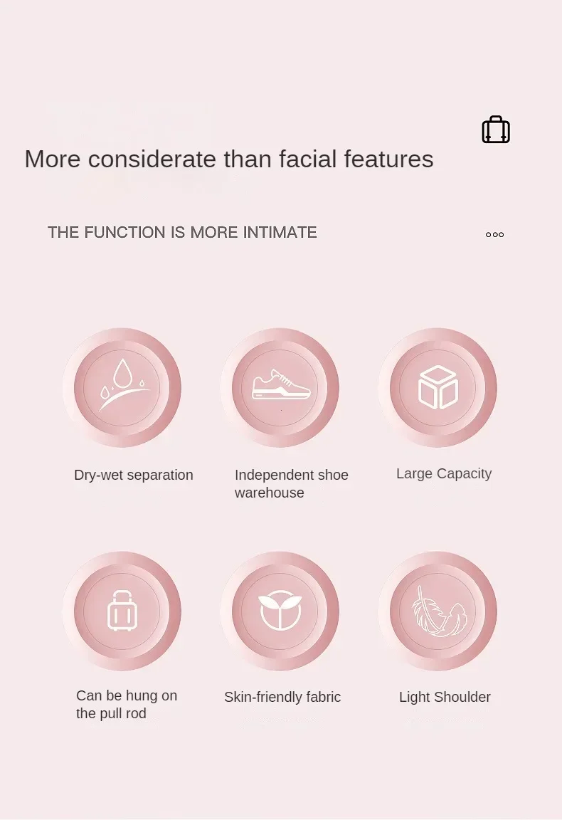 - Bolso interno com tecnologia de separação seco e molhado para armazenamento seguro de roupas úmidas.