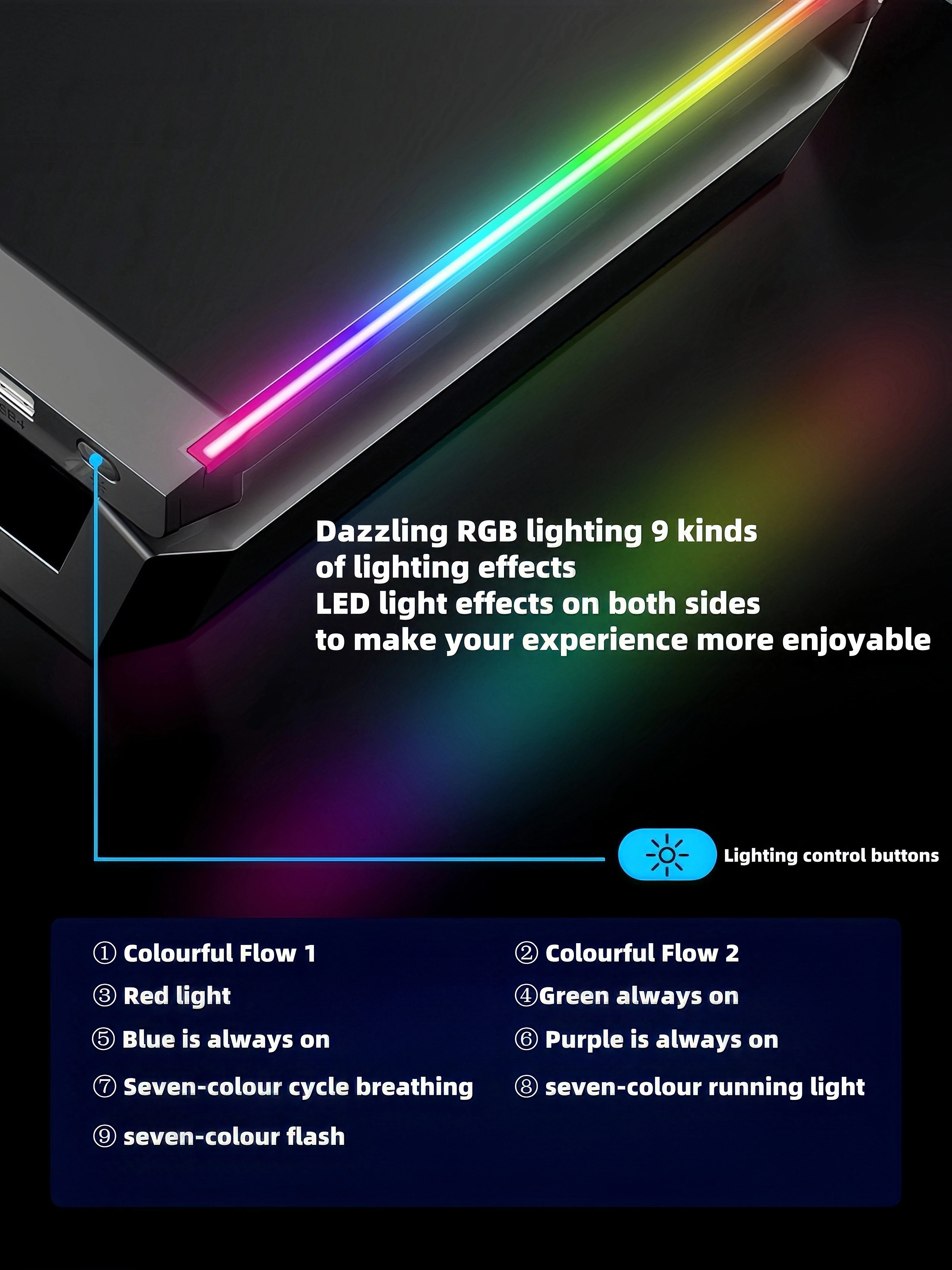- Iluminação RGB decorativa com 7 cores e múltiplos efeitos
