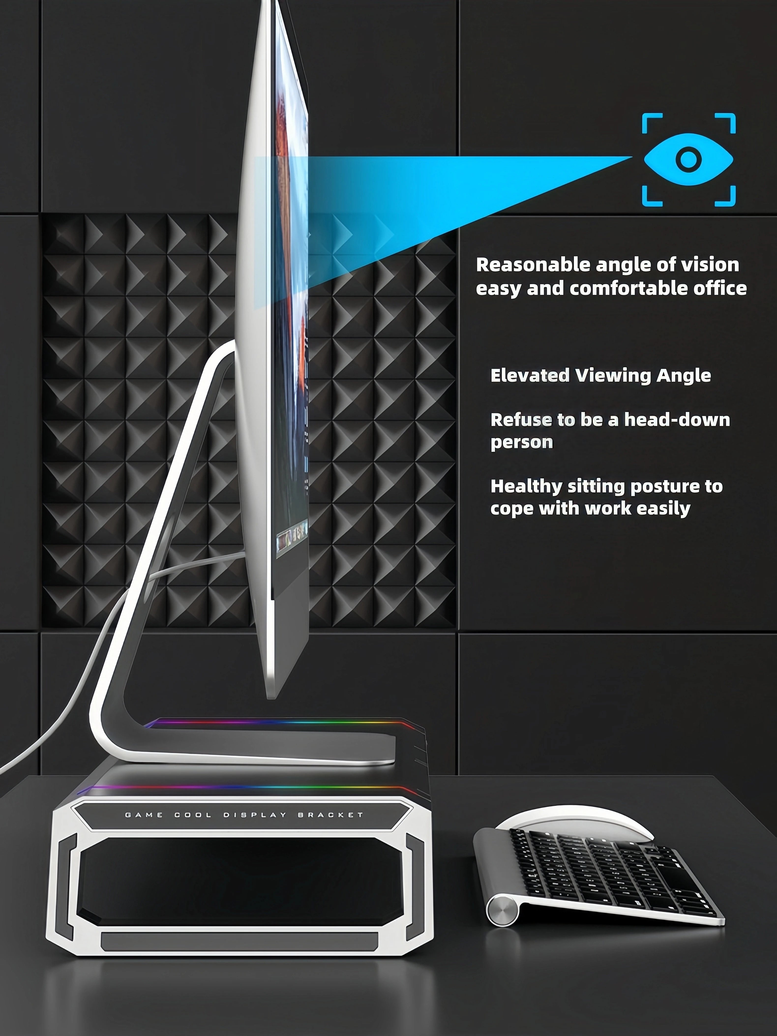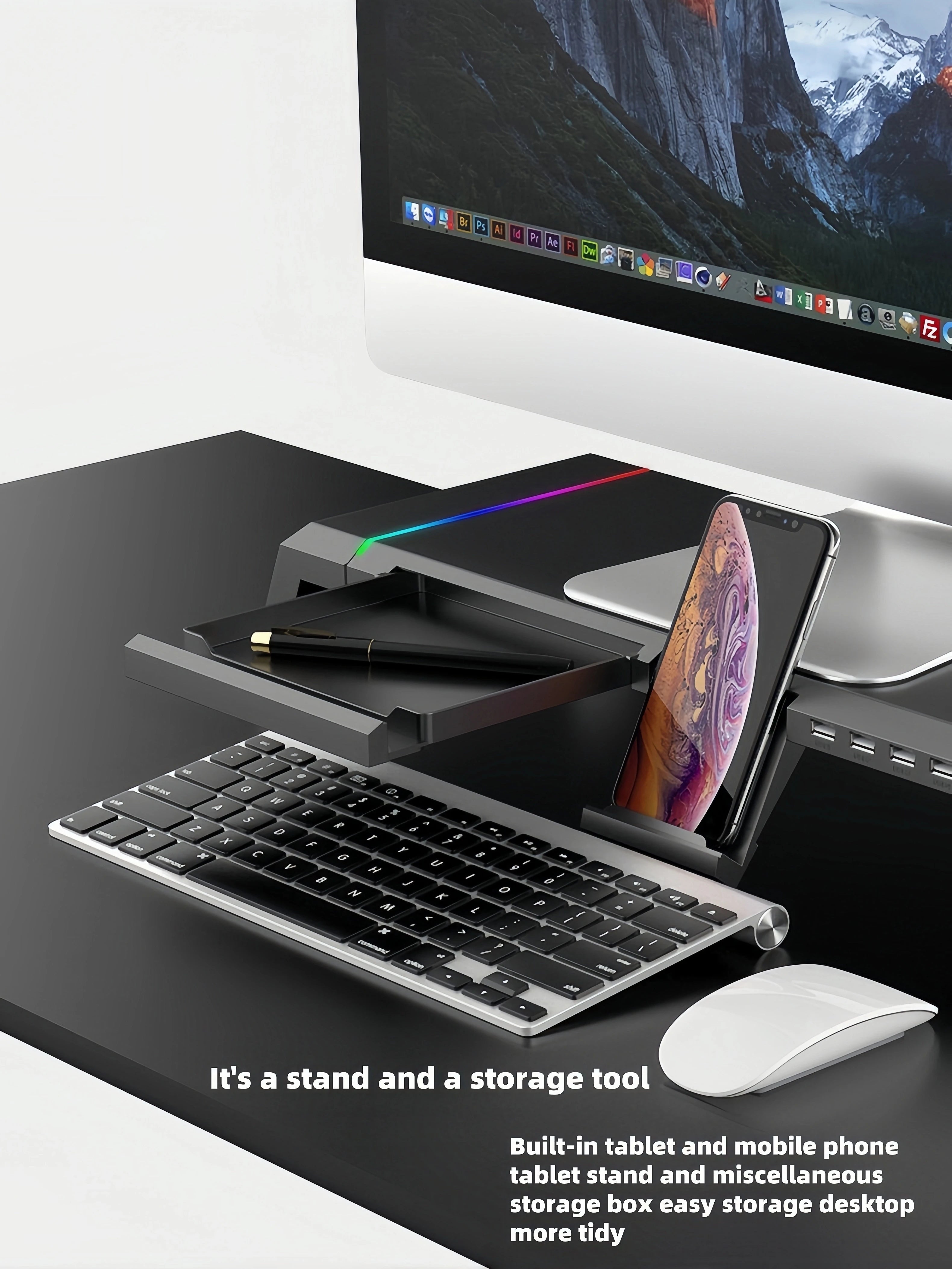 O suporte de monitor multifuncional com RGB e USB foi desenvolvido para transformar a organização e a ergonomia do seu espaço de trabalho ou setup gamer. Projetado para elevar o monitor a uma altura confortável, este suporte de monitor para PC e notebook ajuda a melhorar a postura, reduzir a inclinação excessiva da cabeça e proporcionar uma experiência de uso mais saudável e produtiva no dia a dia.