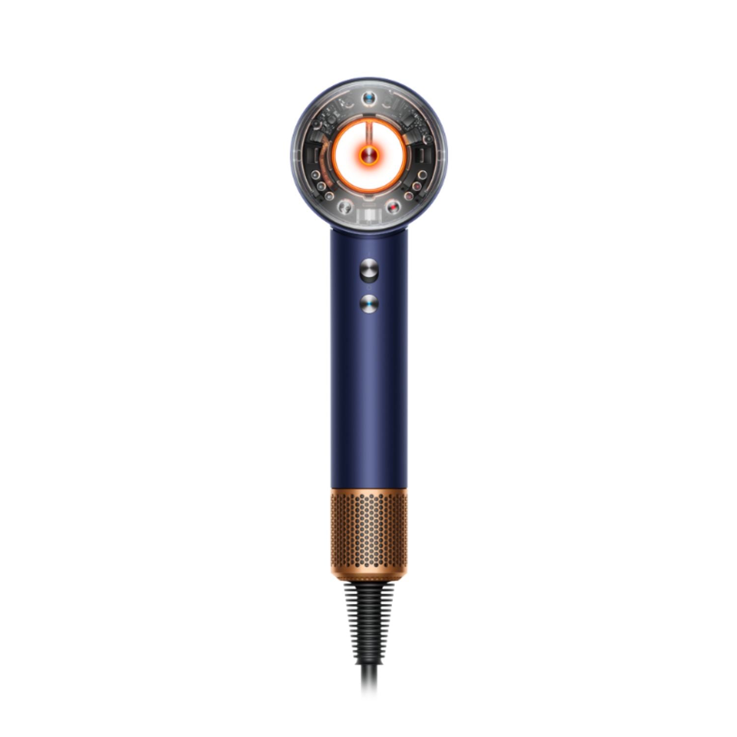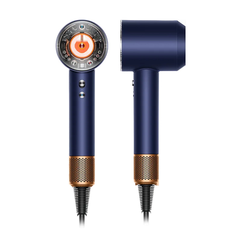 O motor Dyson Hyperdymium™, pequeno e extremamente potente, trabalha em conjunto com a tecnologia Air Multiplier™ para gerar um fluxo de ar controlado e de alta velocidade, garantindo secagem eficiente mesmo em cabelos mais densos. O modelo conta com acabamento Azul Prússia e opera em voltagem 220 V.