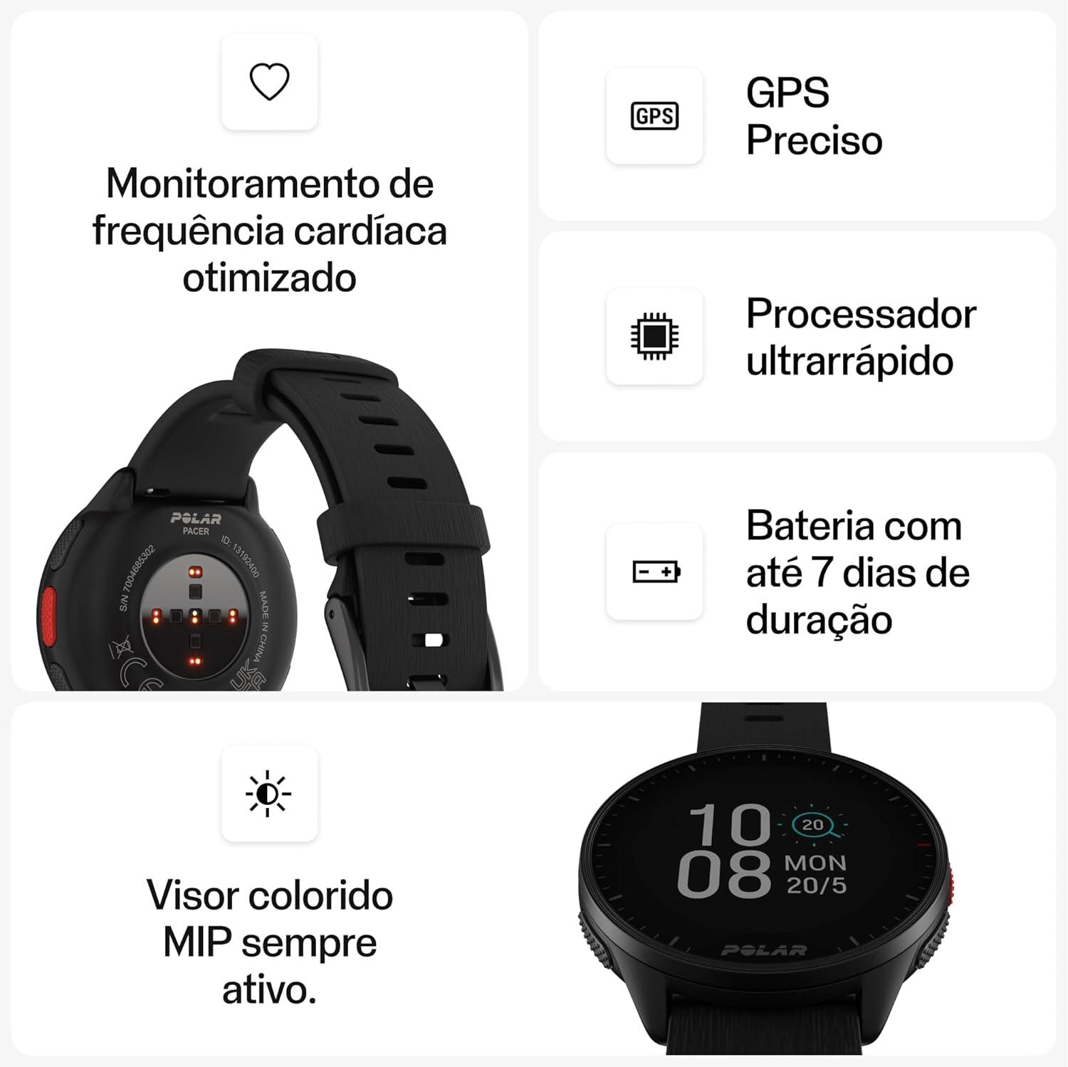 Polar Pacer | Smartwatch Esportivo com Monitoramento de Corrida e Frequência Cardíaca | Preto