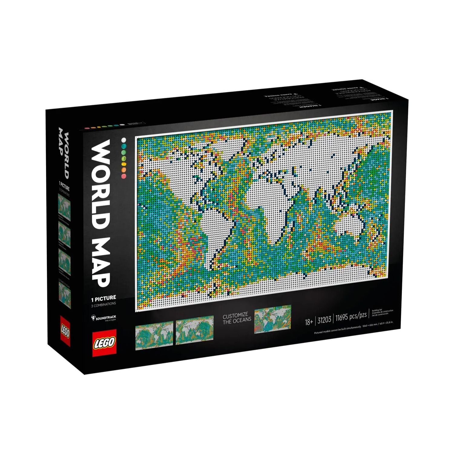 LEGO Mapa Mundi 31203 é um conjunto exclusivo da linha LEGO Art, projetado para adultos e colecionadores que buscam criar experiências criativas únicas. Com 11.695 peças, este LEGO Art Mapa do Mundo permite montar três versões personalizáveis do mapa mundial, ajustando continentes e oceanos ao gosto do usuário. O set combina decoração de parede, hobby construtivo e colecionismo, oferecendo horas de entretenimento e relaxamento criativo. Além disso, a montagem inclui uma trilha sonora temática que transforma a construção em uma experiência imersiva e meditativa.